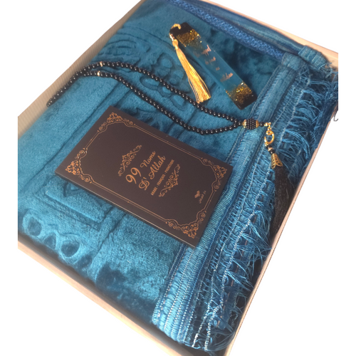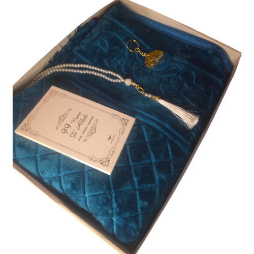 Coffret de prière bleu – Tapis 70×110 cm, chapelet et porte-clés “Salam”